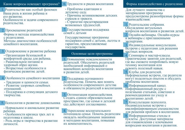 Программа Просвещения родителей (законных представителей) детей дошкольного возраста, посещающих дошкольные образовательные организации, представляет собой документ, направленный на оказание помощи педагогам дошкольного образования в определении содержания и форм просвещения родителей.